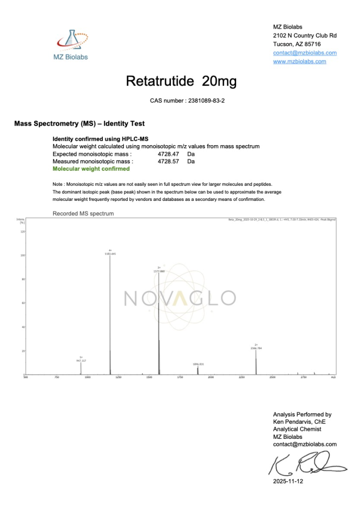 This COA for Retatrutide 20mg from Novaglo Research confirms: